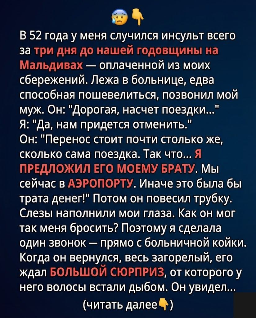 За три дня до нашей поездки на Мальдивы в честь 25-летия свадьбы моя жизнь изменилась в одно мгновение. Я перенесла инсульт, когда готовила ужин, и всё, что я считала само собой разумеющимся — речь, движение, даже уверенность в себе — внезапно исчезло. Пока я лежала в больнице, учась принимать эту новую реальность, позвонил мой муж.