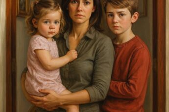 Валя стояла на пороге с двухлетней Машей на руках. Четырёхлетний Артём прятался за её спиной, всхлипывал.
