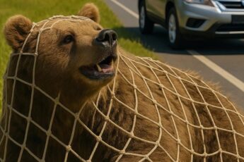 На дороге заметил медведя, который запутался в сети и не мог выбираться: я остановился и помог медведя