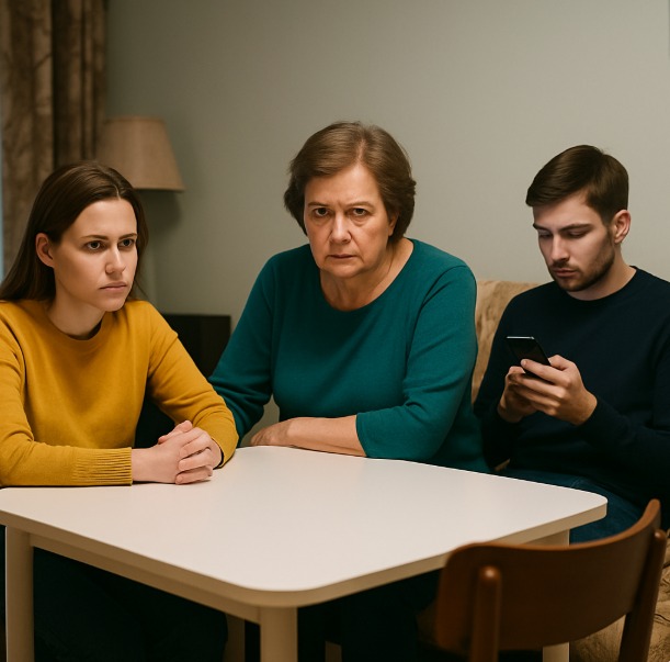 Марина сбросила туфли в прихожей и, поправив блузку, направилась к гостиной. В дверном проёме она замерла. За столом сидели все трое: Олег избегал её взгляда, уставившись в свой телефон, Лена нервно крутила в руках чашку, а Валентина Петровна, свекровь, сидела прямо как струна, сложив руки на груди. Атмосфера была настолько напряжённой, что Марина почувствовала, как у неё пересохло в горле.