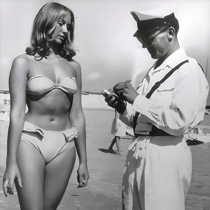 Тот самый снимок 1957 года, где «полицейский штрафует девушку в бикини» на пляже Римини, до сих пор вызывает споры.