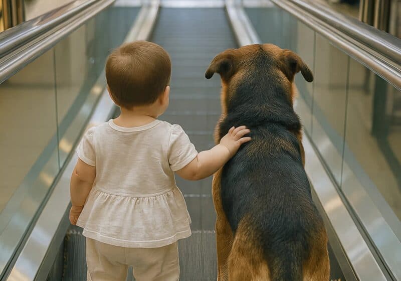 Рядом с ней — крупная собака, похожая на немецкую овчарку, уверенно смотрела вперед и спокойно шагала вниз по движущимся ступеням. Девочка держалась рукой за шерсть собаки, словно это был самый надежный поручень на свете.