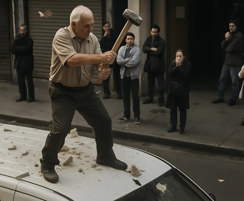 На узкой улице старого квартала внезапно раздался резкий, глухой звук, будто кто-то с невероятной силой ударил по толстому металлическому листу. Прохожие вздрогнули и обернулись. Источник шума был очевиден: на крыше белого фургона стоял пожилой мужчина с седыми волосами, сжимая в обеих руках тяжёлую кувалду.