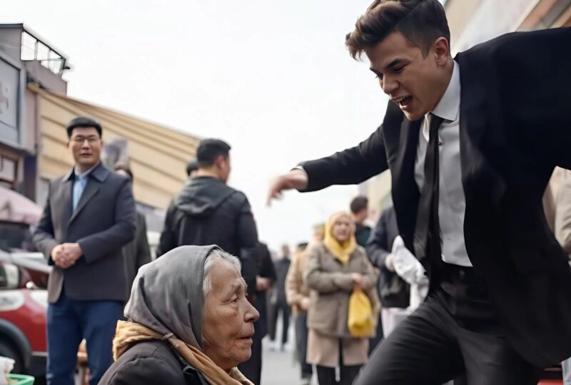 К ним подошёл местный мужчина, который всё это видел. Он резко оттолкнул мужчину в костюме от бабушки.