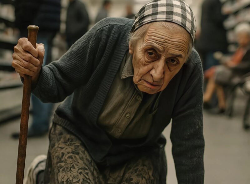 Несколько человек обернулись. Кто-то замер на секунду, потом отвернулся. Женщина у полки продолжила выбирать йогурты, мужчина у кассы сделал вид, что ничего не заметил. Бабушка пыталась подняться, но ноги не слушались. Она схватила трость, подтянулась, но снова упала.