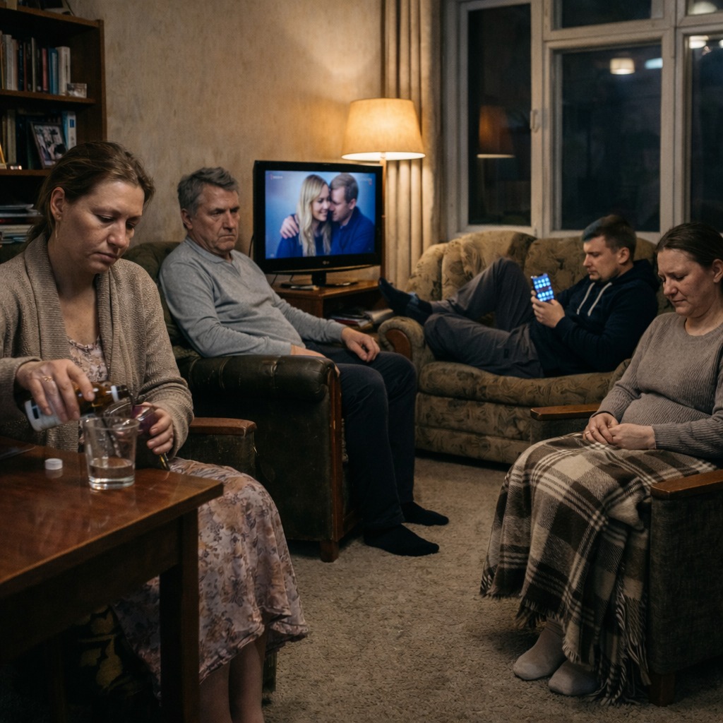 В квартире родителей висела тяжелая, гнетущая атмосфера. Мать пила корвалол на кухне, отец угрюмо смотрел в телевизор, не включая звук. Денис вальяжно раскинулся на диване в гостиной, листая что-то в телефоне. Заплаканная Алина с округлившимся животом сидела в кресле, нервно теребя край пледа.