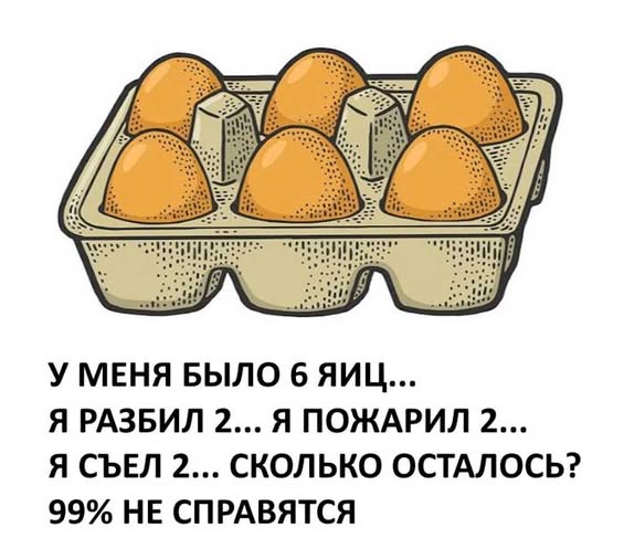 У меня 6 куриных яиц. 2 я разбил, 2 — пожарил, 2 — съел.