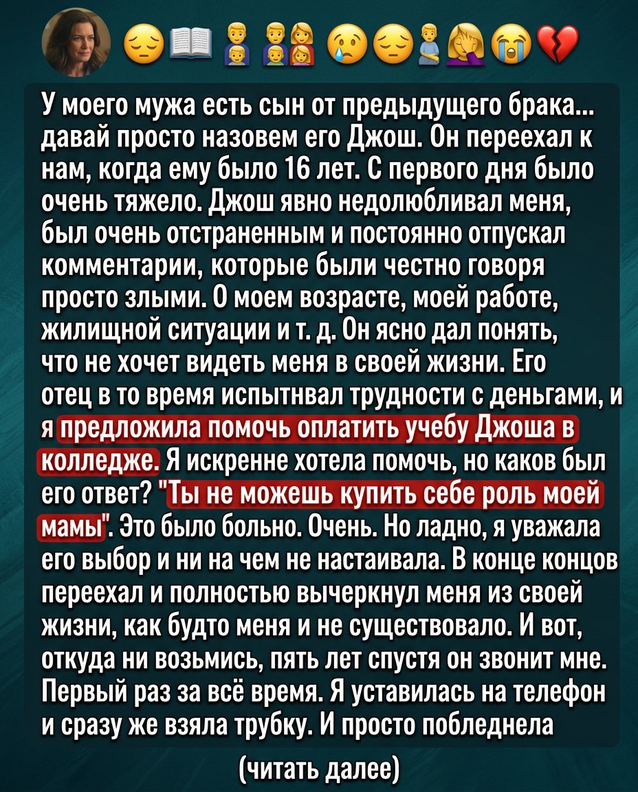 С первого дня он ясно дал понять, что мне не рады в его понимании «семьи». Если я предлагала посмотреть фильм всем вместе, он громко вздыхал и исчезал в своей комнате. Если я готовила что-то, что он раньше любил, он отодвигал тарелку и бормотал: «Мама никогда так не готовила».