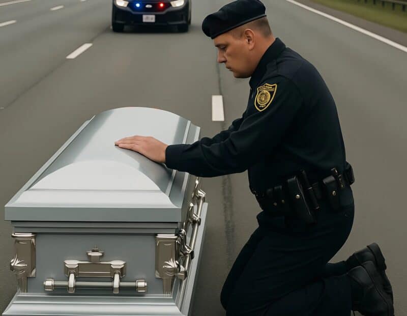 Во время утреннего патрулирования трассы я заметил нечто странное. Пустая, прямая дорога тянулась на многие километры, и вдруг — посреди асфальта, в самом правом ряду, стоял белый гроб.