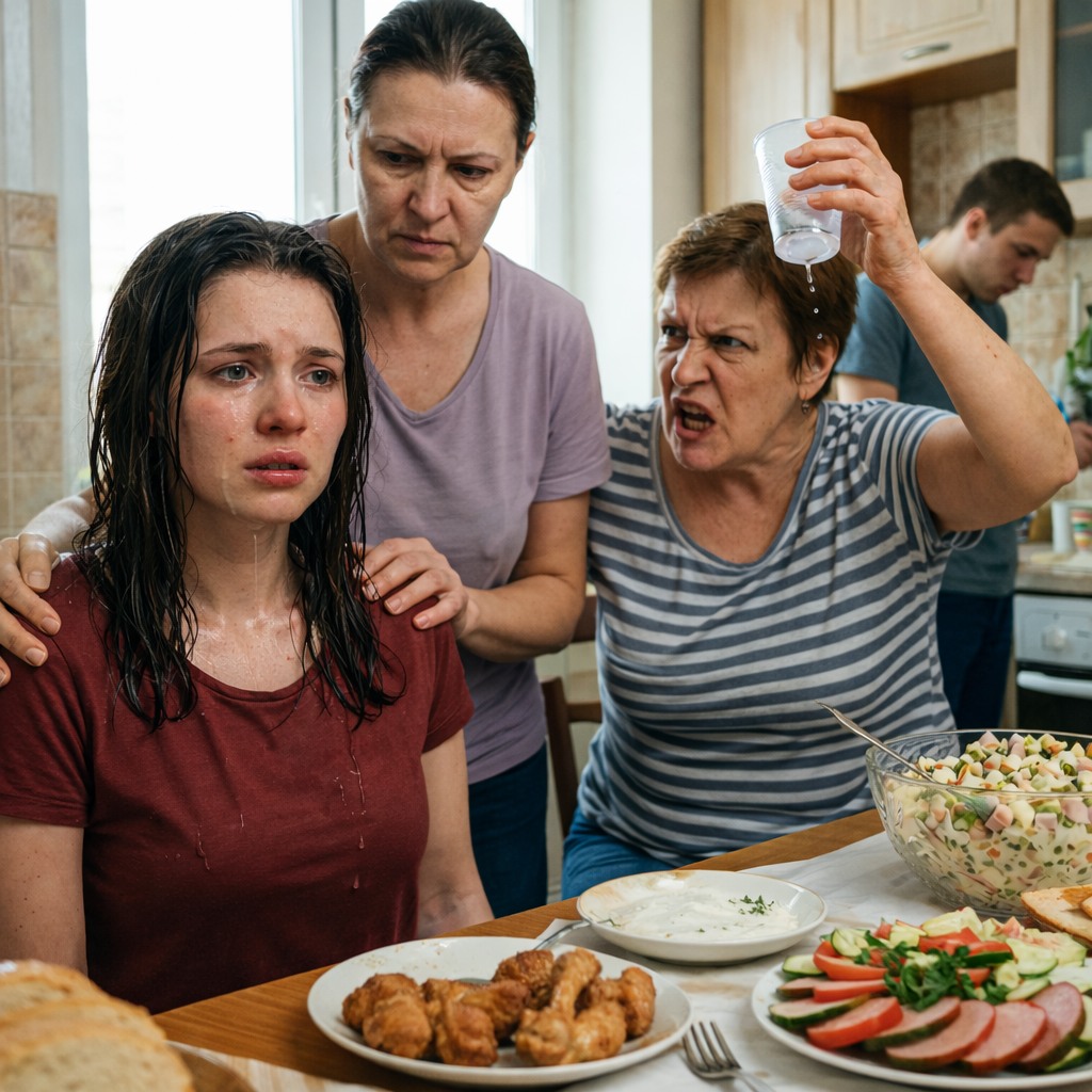 И тут произошло то, чего не ожидал никто. Анна Захаровна, тяжело задышав от раздражения и осознания собственной власти над невесткой, резко схватила свой наполовину полный стакан с минеральной водой. С размаху, почти не целясь, она плеснула воду прямо в лицо Наташе.