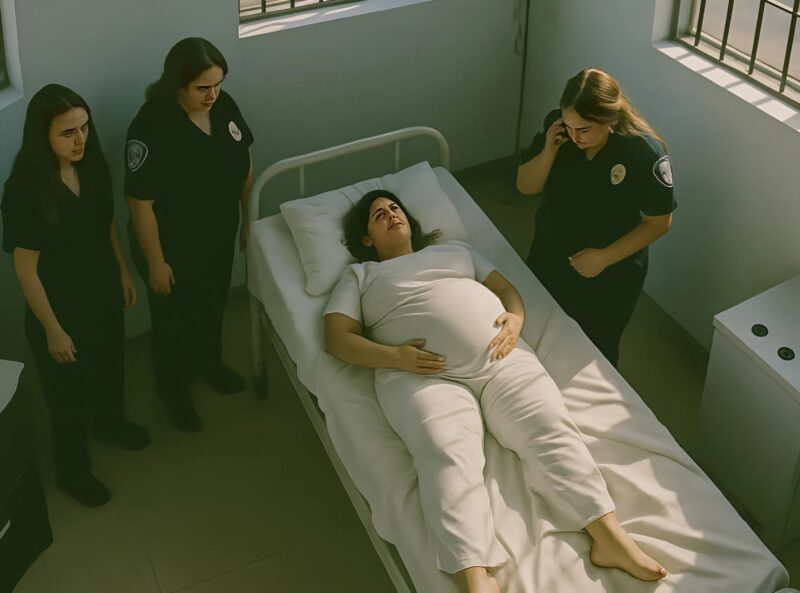 Скрипнула тяжёлая дверь. В палате, больше похожей на камеру, на узкой металлической койке лежала беременная женщина. Она держала руки на огромном животе и смотрела в пол. Лицо было бледным, волосы растрёпанными. Но в её неподвижности было что-то странное: не страх и не боль, а будто смирение.
